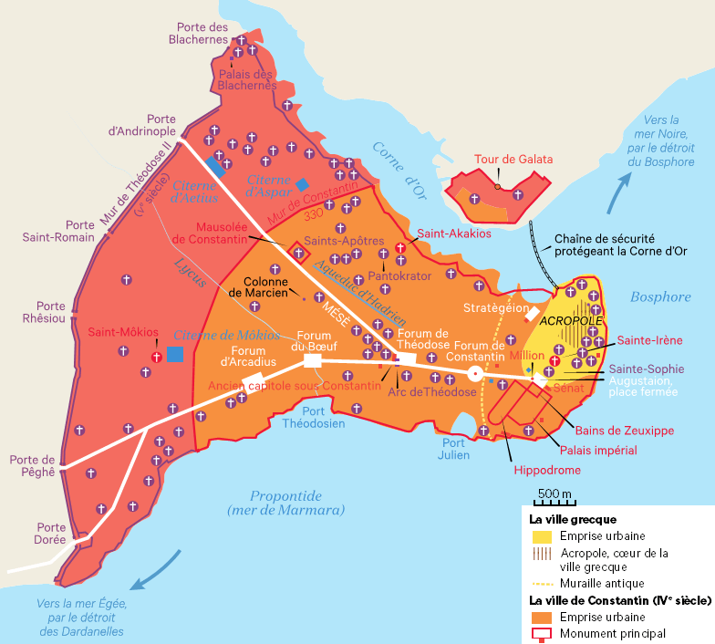 Les défenseurs de Byzance sont confiants. Ils sont secondés par des Génois, qui occupent la colline de Galata (voir la carte). La ville a résisté à tous les sièges depuis 11 siècles grâce à trois lignes de défense et des citernes d’eau d’une capacité totale de plus d’un million de m³, dont la célèbre citerne souterraine « Basilique », qui se visite. Elle est un des lieux emblématiques du roman de Dan Brown, « l’Enfer », avec les ville de Florence.
