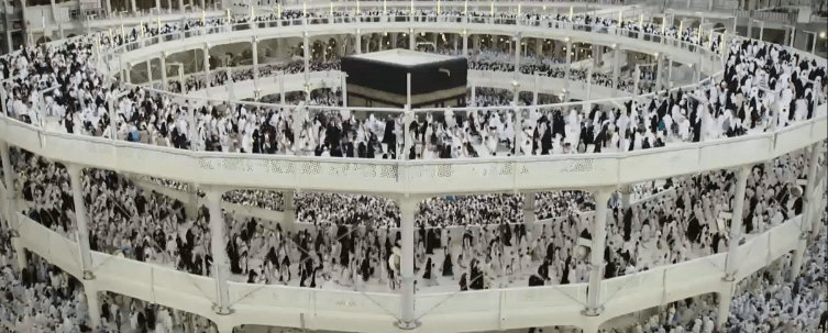A gauche, la circonvolution autour de la Kaaba et à droite, la lapidation de Satan (figuré par le piliers à l’avant plan)