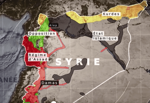 Début 2013, l’État islamique, qui s’est constitué en Iraq, pénètre en Syrie où les milices djihadistes lui prêtent allégeance. De leur fusion naît DAESH, l’État islamique en Iraq et au Levant (le Sham, c’est la Syrie). Cette organisation est lourdement armée, elle a pillé les arsenaux américains de la région de Mossoul. Elle balaie tout sur son passage. Les États-Unis et ses alliés européens décident alors d’intervenir militairement par des frappes contre DAESH. La Russie leur emboîte le pas. Pour ne pas se gêner, la Syrie est divisée en deux zones militaires : à l’ouest de l’Euphrate, la Russie, à l’est, les États-Unis.