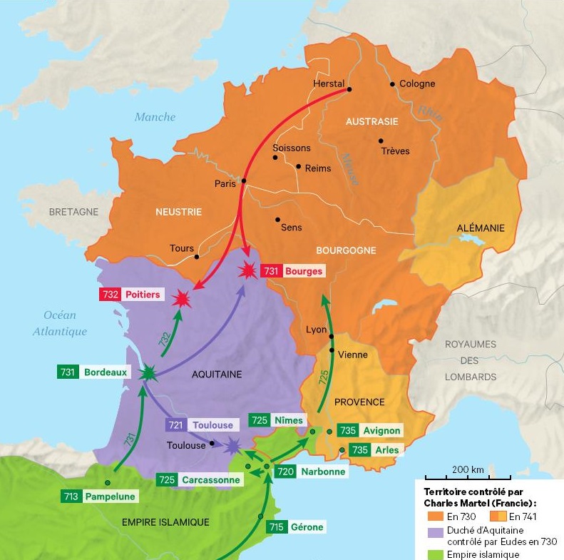 Ce n’est que partie remise, en 732, l’émir abd er-Rahman remonte le long de la côte et pille Bordeaux. Cet émir n’a rien à voir avec le dernier des Omeyyades, ni avec celui qui se proclamera calife à Cordoue en 911. Le nom d’abd er-Rahman est très répandu, il signifie le « serviteur du Miséricordieux« .