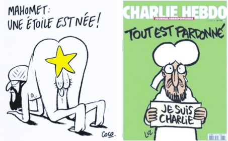 Le dessin de droite a fait la une de Charlie Hebdo une semaine après le massacre perpétré dans la rédaction du journal le 7 janvier 2015 (12 morts et 11 blessés). Le symbole du dessin est compréhensible et ne devrait pas choquer.