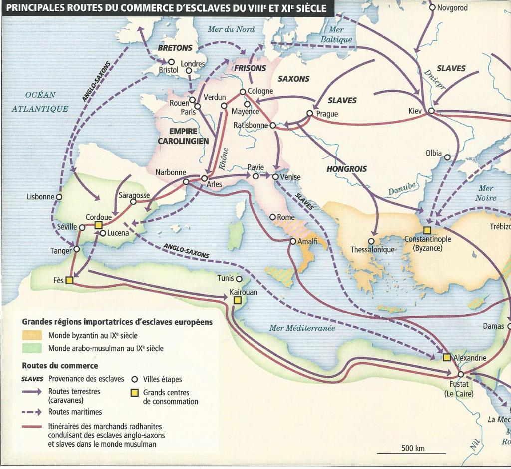 L’esclavage ne disparut pas avec la chute de l’Empire romain, il était courant chez les Germains. Aux temps des Carolingiens, Verdun était même une plaque tournante du trafic d’esclaves. Les derniers païens, Saxons et Slaves, capturés à l’est et au nord de l’Europe, étaient rassemblés pour être acheminés vers la Méditerranée et être vendus à Byzance ou dans le monde islamique. C’est le mot « slave » qui sera à l’origine du terme « esclave » (slave en anglais).