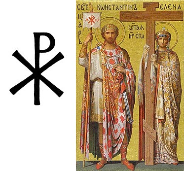 Lactance dans son ouvrage De la mort des persécuteurs de l’Église chapitre XLIV, nous dit que « Constantin, [est] averti en songe de faire peindre sur les boucliers de ses soldats le signe adorable (?) de la croix et d’engager ensuite le combat ». En fait de croix, il précise qu’il s’agit du chrisme (les lettres X (chi grec) et P (rho) entrelacées).