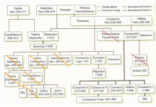 Ce sont donc les fils de Constantin qui seront les premiers empereurs chrétiens. Mais tout comme leur père, on ne peut pas dire qu’ils aient assimilé ce qui devrait être l’apanage du christianisme, l’amour du prochain. Constantin fit assassiné son fils aîné Crispius ainsi que son épouse Flavia, mère des futurs empereurs. Ceux-ci se sont déchainés à la mort de leur père, éliminant oncles et cousins auxquels Constantin avait donné une fonction dans l’Empire.