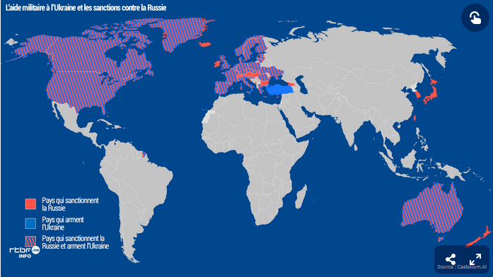 Carte extraite de l’article de la RTBF montant les pays sanctionnant la Russie