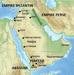 Or, la Péninsule arabique n’était pas un monde fermé, ce monde était en contact avec les empires perse et byzantin et surtout avec le puissant royaume d’Himyar, tantôt sous domination du royaume d’Aksoum, tantôt indépendant (voir la carte).
