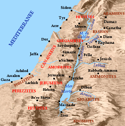 La Bible nomme la région « terre de Canaan », du nom d’un petit-fils de Noé, fils de Cham. Cham ayant surpris son père Noé nu, celui-ci maudit Canaan. Oui, c’est très tordu comme récit, d’autant plus que YHWH a donné la terre de Canaan aux Hébreux.