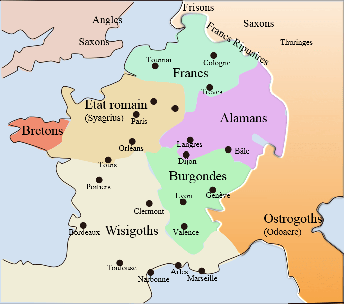 En 489, Théodoric, un Ostrogoth arien très cultivé, s’installe à Rome et chasse Odoacre, qui avait dépossédé le dernier empereur et provoqué ce que l’Histoire appelle la fin de l’Empire romain (d’Occident). L’empereur romain d’Orient Zénon (474-491) lui confie le « Sénat et le Peuple Romain » (SPQR : Senatus populusque romanus) et lui envoie les insignes du pouvoir qu’Odoacre avait dédaignés quelques années plus tôt. Théodoric devient donc le numéro 2 de l’empire, après l’empereur d’Orient, et par une habile politique de mariages, devient le protecteur de tous les peuples germains. Clovis lui a donné sa sœur en mariage.