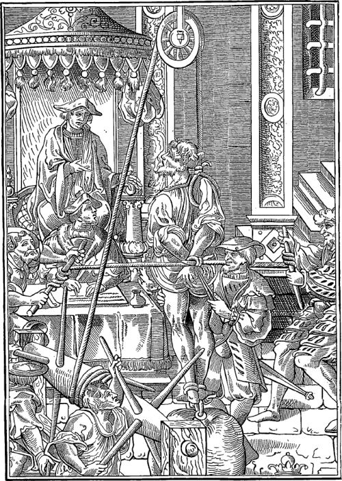 Avec la recherche des marques, la torture est un autre moyen d’arriver aux aveux. Dans un premier temps on se contente de priver l’accusé de sommeil ou de lui imposer la présence de moines qui l’encouragent à avouer et qui empêchent le Diable de lui venir en aide. Puis on en vient aux tourments : on simule la noyade, on écrase les doigts, les genoux ou on utilise l’estrapade, entre autres. La différence entre la question ordinaire et extraordinaire réside dans la durée ou la violence de la séance. Ainsi, pour l’estrapade (voir illustration ci-après), dans un premier temps, la corde est peu solide, quand on fait violemment retomber l’accusé, la corde casse et il est projeté par terre. Ensuite, la corde, plus solide, le maintient à quelque distance du sol, brisant ses articulations lors de la chute.